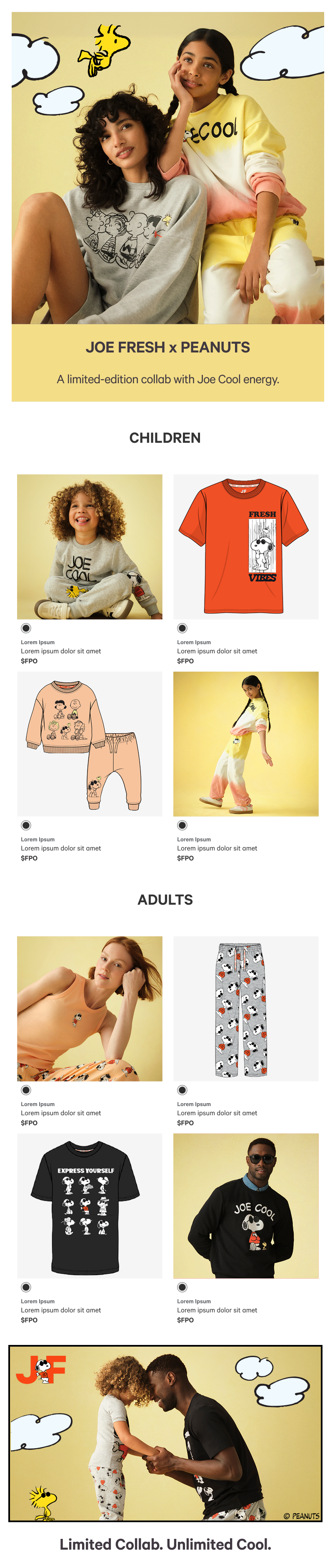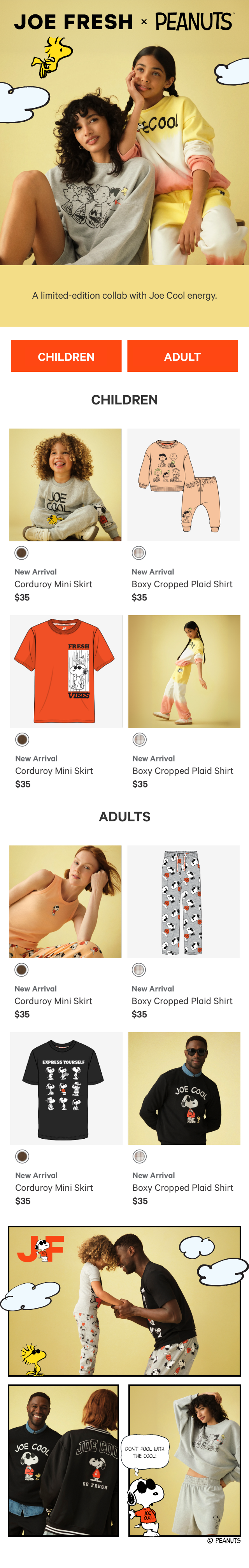 A collab between brands featuring “Joe Cool,” Snoopy’s iconic alter ego. All e-commerce assets below were created using official Peanuts illustrations to curate a blended world of JF and Peanuts. Note that assets were built out whilst strictly following both JF and Peanuts brand guidelines.